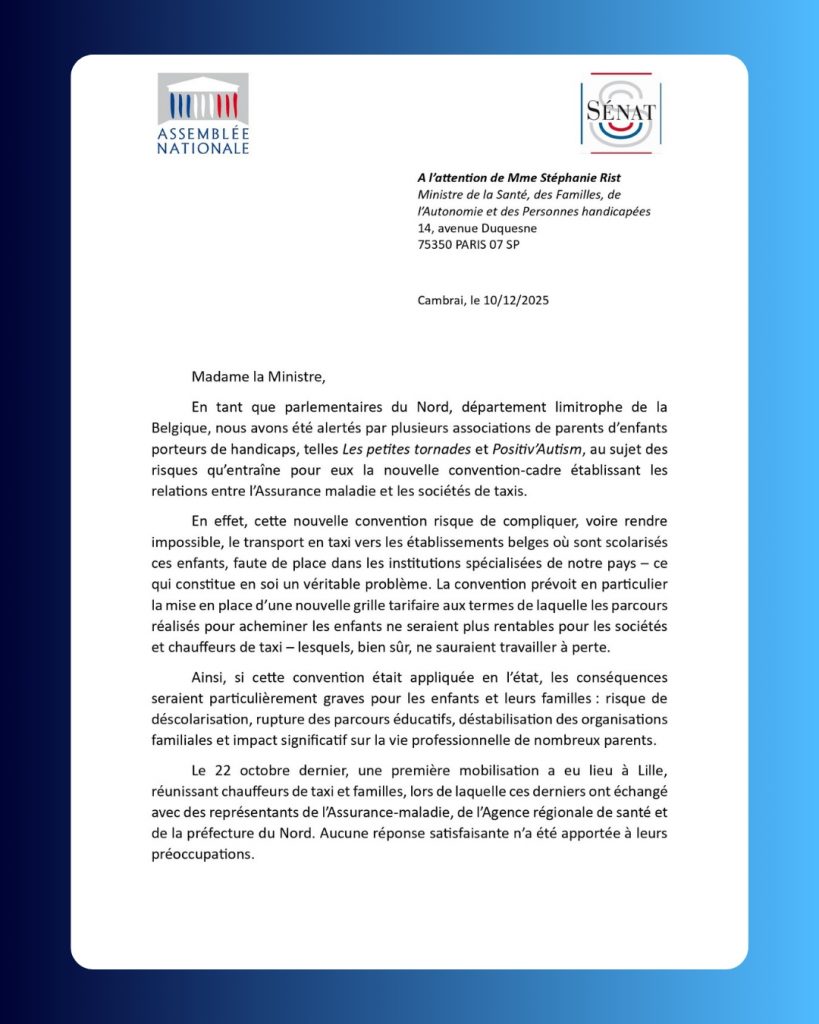 La situation des enfants porteurs de handicap scolarisés en Belgique inquiète fortement plusieurs parlementaires du Rassemblement National, dont Sandra Delannoy, députée de la 3ᵉ circonscription du Nord. Avec plusieurs de ses collègues – Sébastien Chenu, Joshua Hochart, Matthieu Marchio, Alexandre Dufosset, Thierry Tesson, Michael Taverne et Guillaume Florquin – elle a officiellement interpellé la ministre de la Santé sur les conséquences graves de la nouvelle convention entre l’Assurance maladie et les sociétés de taxis.